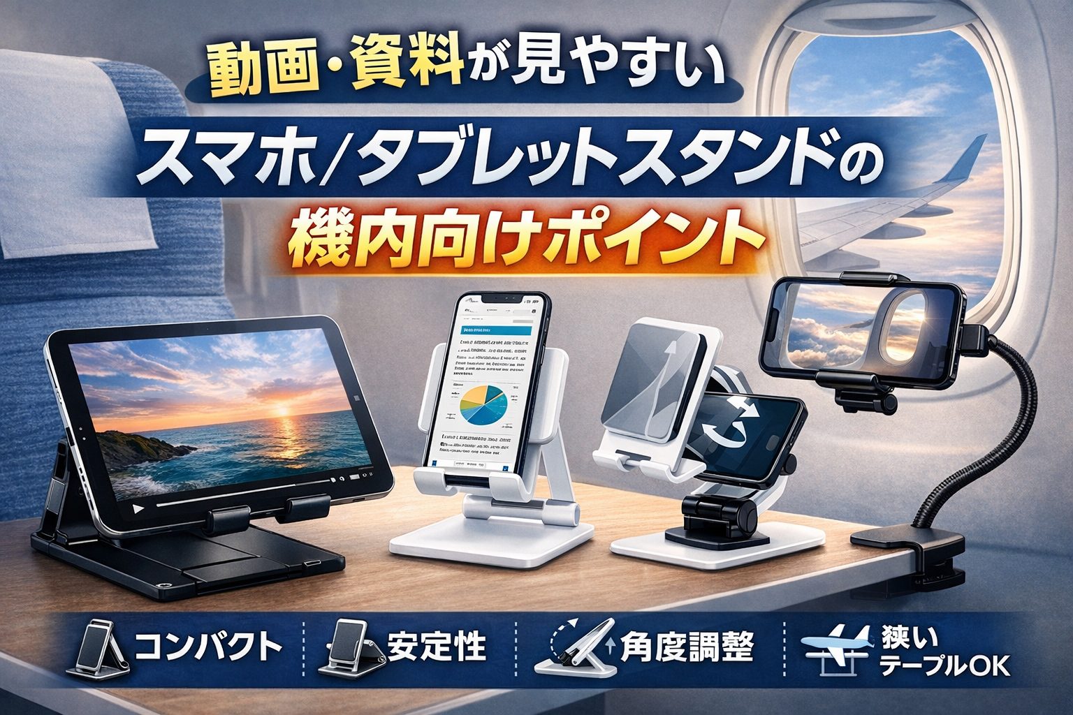 動画・資料が見やすい:スマホ/タブレットスタンドの機内向けポイント